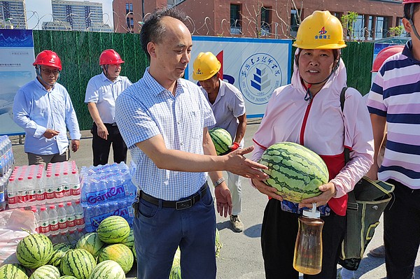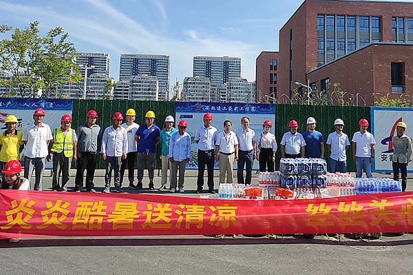 時(shí)至盛夏,驕陽似火,持續(xù)高溫,2022年7月12日,學(xué)院副院長(zhǎng)周元清、工會(huì)主席張斌深入水湖校區(qū)二期工程第一階段項(xiàng)目建設(shè)現(xiàn)場(chǎng)開展“送清涼”慰問活動(dòng),給奮戰(zhàn)在高溫一線的水湖校區(qū)建設(shè)者們送去西瓜、綠豆、礦泉水、藿香正氣液、花露水、人丹等防暑降溫用品,代表學(xué)院表達(dá)了真摯的關(guān)心和問候。安徽建工集團(tuán)總承包公司合肥分公司黨支部書記鄭蕾、新校區(qū)建設(shè)辦公室及各參建單位負(fù)責(zé)人陪同參加。