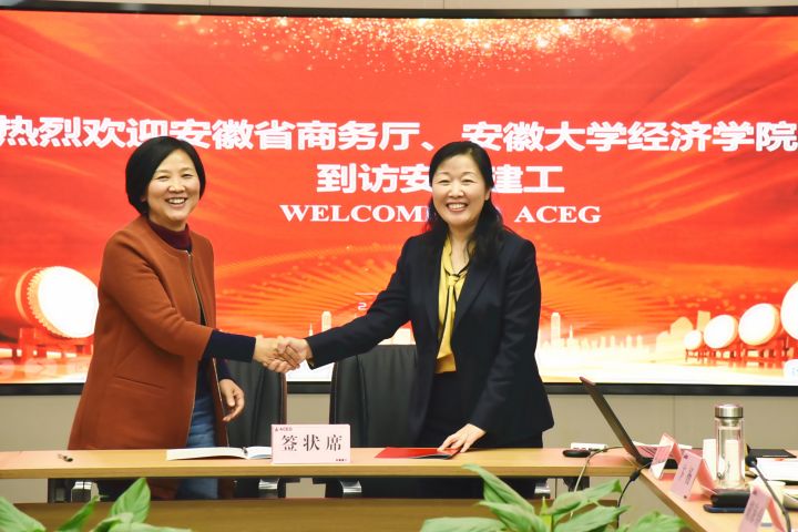 邢應(yīng)梅對孫永彬處長、顧廣玲書記一行表示熱烈歡迎,對省商務(wù)廳、安徽大學(xué)經(jīng)濟(jì)學(xué)院長期給予安徽建工的關(guān)心和支持表示衷心感謝!她介紹了安徽建工集團(tuán)的發(fā)展歷史及近年來取得的成就、海外業(yè)務(wù)發(fā)展情況。她指出,簽署校企合作協(xié)議是雙方合作的良好開端,相信通過雙方共同努力,實行優(yōu)勢互補(bǔ)、工學(xué)結(jié)合,定能將合作推向新高度,為安徽建工海外業(yè)務(wù)、我省外經(jīng)貿(mào)業(yè)務(wù)發(fā)展貢獻(xiàn)力量。