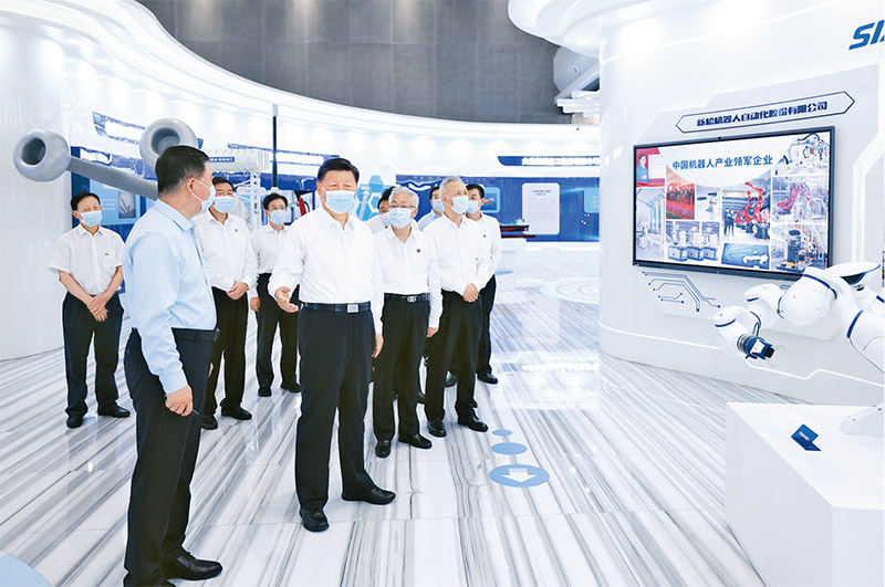 2022年8月16日至17日,中共中央總書記、國家主席、中央軍委主席習近平在遼寧考察。這是17日下午,習近平在沈陽新松機器人自動化股份有限公司展廳,了解公司生產(chǎn)經(jīng)營、自主創(chuàng)新情況。 新華社記者 鞠鵬/攝