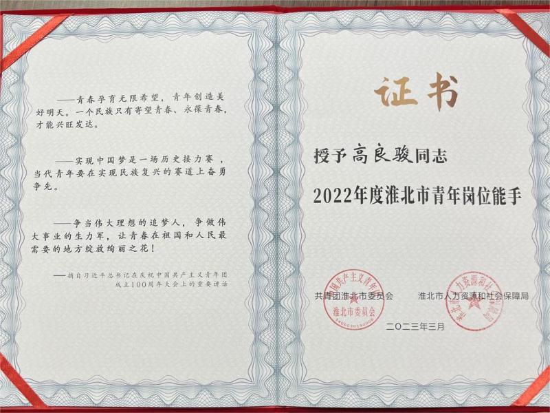 為深入學(xué)習(xí)貫徹習(xí)近平新時(shí)代中國(guó)特色社會(huì)主義思想,認(rèn)真貫徹落實(shí)習(xí)近平總書(shū)記對(duì)技能人才工作的系列重要指示精神,淮北市團(tuán)市委聯(lián)合淮北市人力資源和社會(huì)保障局開(kāi)展了2022年度“淮北市青年崗位能手”命名活動(dòng),建材科技三分公司高良駿被授予“淮北市青年崗位能手”榮譽(yù)稱號(hào)。
