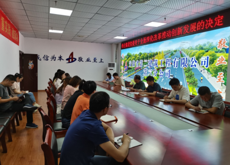 第六公司黨支部傳達(dá)學(xué)習(xí)安徽建工集團(tuán)全面深化改革推動(dòng)創(chuàng)新發(fā)展動(dòng)員部署暨主題教育黨課報(bào)告會(huì)精神。會(huì)議要求,一要提高政治站位,統(tǒng)一思想認(rèn)識(shí),充分認(rèn)識(shí)到集團(tuán)深化改革推動(dòng)創(chuàng)新發(fā)展是一項(xiàng)意義重大、影響深遠(yuǎn)的綜合性改革,是集團(tuán)在新起點(diǎn)上,把握新形勢(shì)新要求,謀劃新思路新發(fā)展的舉措,要全面貫徹落實(shí)建工控股黨委的決策部署,認(rèn)真把握集團(tuán)全面深化改革推動(dòng)創(chuàng)新發(fā)展的歷史使命;二要緊緊圍繞集團(tuán)戰(zhàn)略部署和工作安排,進(jìn)一步樹立為集團(tuán)大發(fā)展、轉(zhuǎn)型發(fā)展、高質(zhì)量發(fā)展作貢獻(xiàn)的責(zé)任和擔(dān)當(dāng)意識(shí);三要認(rèn)真落實(shí)集團(tuán)工作安排,進(jìn)一步做好市場(chǎng)開拓,搶抓市場(chǎng)先機(jī),持續(xù)推進(jìn)項(xiàng)目標(biāo)準(zhǔn)化建設(shè),嚴(yán)格落實(shí)集團(tuán)、公司各項(xiàng)規(guī)定,樹牢風(fēng)險(xiǎn)意識(shí),做到“五個(gè)嚴(yán)”,持續(xù)推動(dòng)公司改革轉(zhuǎn)型、高質(zhì)量發(fā)展。