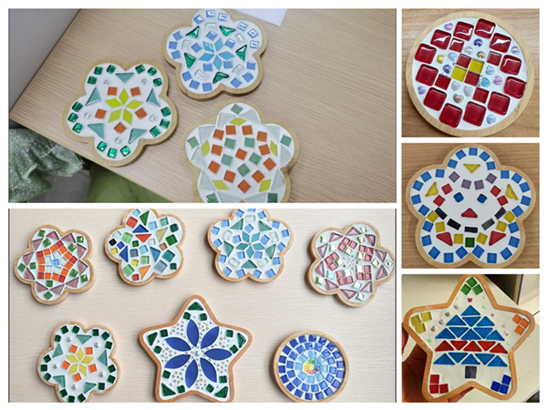 馬賽克石的排列不同,最后呈現(xiàn)出的效果也截然不同,團(tuán)員青年們對(duì)照制作說(shuō)明書,通過(guò)一塊塊彩色琉璃小磚的不同拼接、組合,構(gòu)建出漸變、相間、撞色等多種藝術(shù)效果圖案,讓素色杯墊瞬間散發(fā)出獨(dú)一無(wú)二的藝術(shù)魅力。