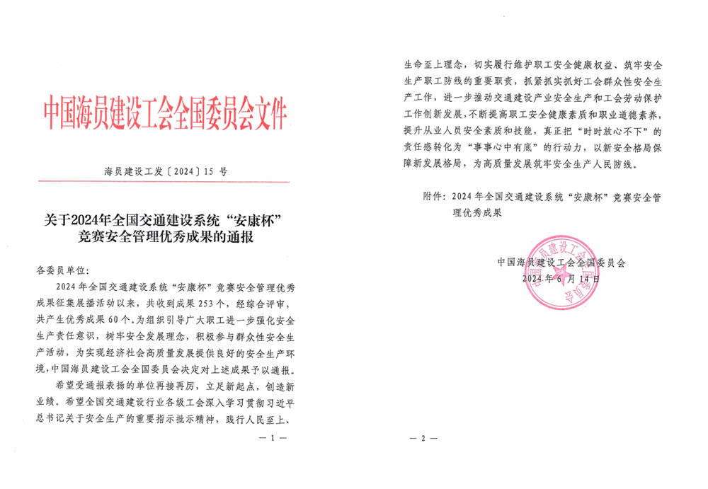 近期,中國海員建設(shè)工會(huì)全國委員會(huì)通報(bào)了2024年全國交通建設(shè)系統(tǒng)“安康杯”競賽安全管理60項(xiàng)優(yōu)秀成果,由集團(tuán)公司和建工三建共同制作的視頻作品《舉“安全之盾” 護(hù)“平安之航”》,從全國交通建設(shè)系統(tǒng)的253項(xiàng)成果中脫穎而出,獲評(píng)“安康杯”競賽安全管理優(yōu)秀成果。