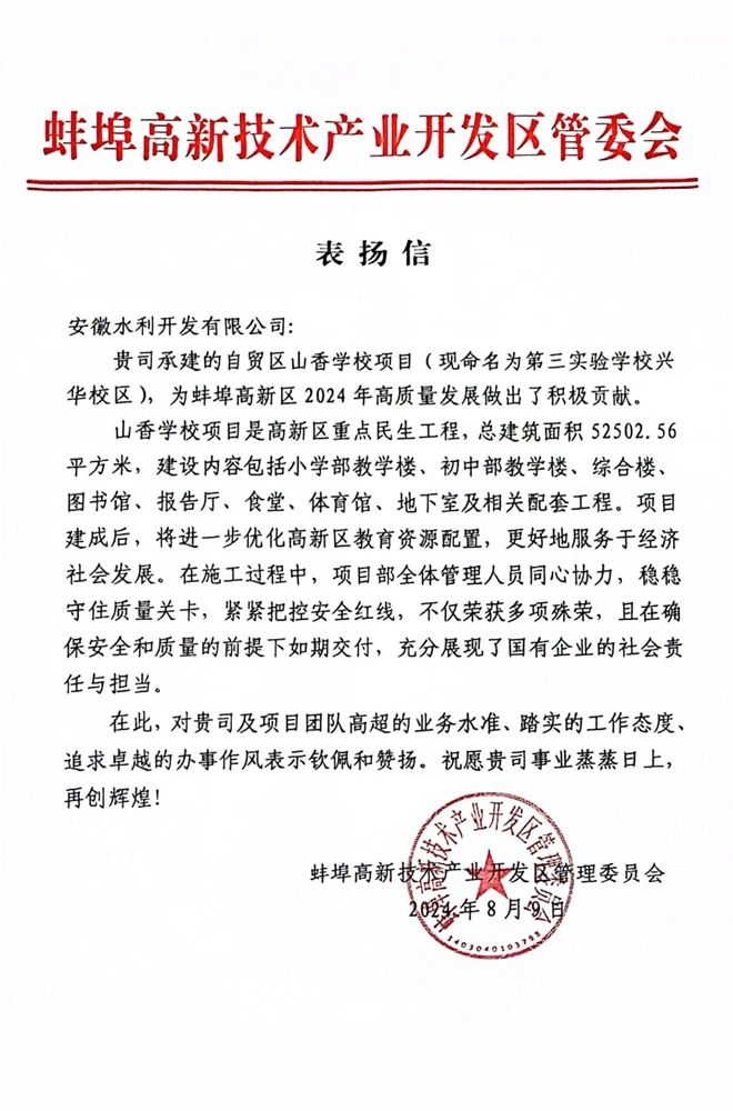 近日,安徽水利山香學(xué)校項目獲蚌埠高新區(qū)管委會來信表揚,對項目團隊在建設(shè)過程中付出的努力和取得的成績給予高度評價。