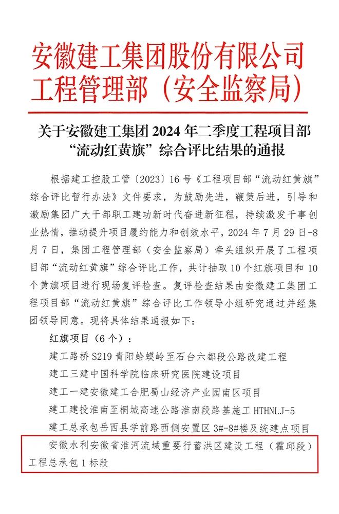近日,由安徽水利承建的安徽省淮河流域重要行蓄洪區(qū)建設(shè)工程(霍邱段)項(xiàng)目在集團(tuán)“流動(dòng)紅黃旗”綜合評(píng)比中成績優(yōu)異,獲評(píng)集團(tuán)二季度“流動(dòng)紅旗項(xiàng)目部”稱號(hào)。