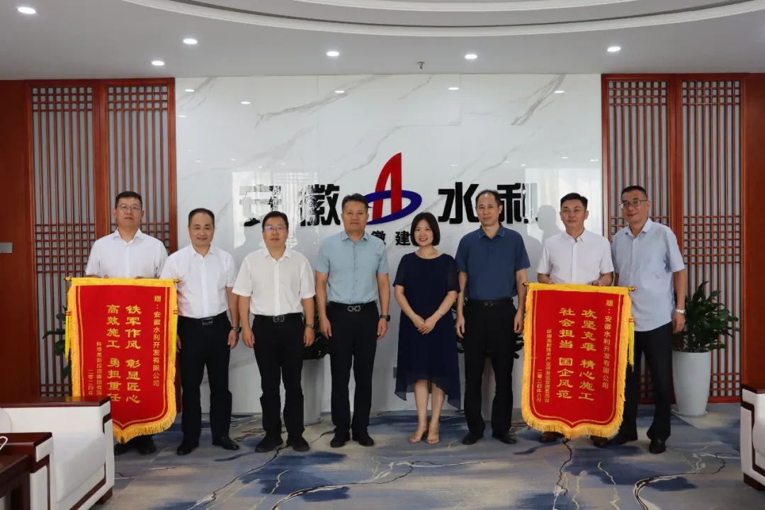 9月5日,蚌埠市高新區(qū)社會(huì)事業(yè)局黨委書(shū)記、局長(zhǎng)錢(qián)玉,蚌埠高新投資集團(tuán)有限公司黨委書(shū)記、董事長(zhǎng)李德旺,副總經(jīng)理陳輝一行來(lái)到安徽水利,將兩面錦旗送到建工股份副總經(jīng)理、安徽水利黨委書(shū)記、董事長(zhǎng)張鍵手中,并就進(jìn)一步深化合作開(kāi)展會(huì)談交流。