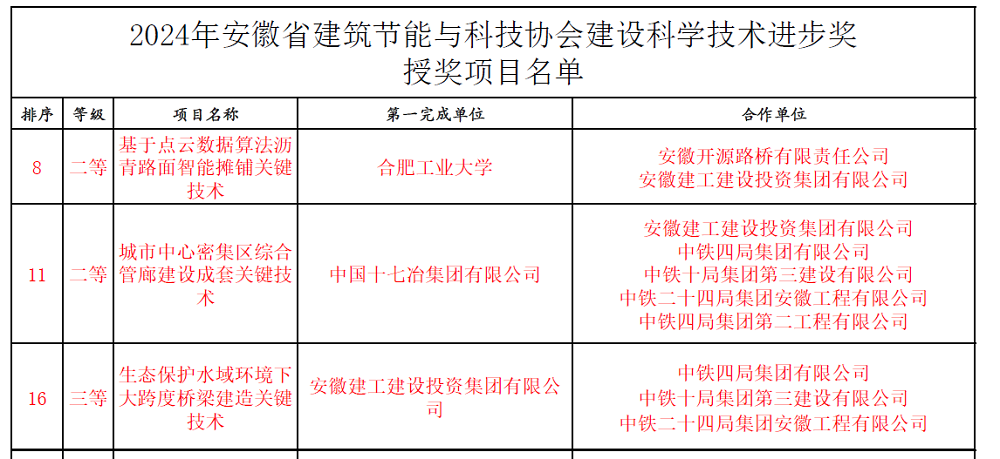近日,2024年建設科學技術進步獎結果公布,建工建投3項成果脫穎而出,其中“基于點云數(shù)據(jù)算法瀝青路面智能攤鋪關鍵技術”和“城市中心密集區(qū)綜合管廊建設成套關鍵技術”2項成果獲二等獎,“生態(tài)保護水域環(huán)境下大跨度橋梁建造關鍵技術”成果獲三等獎。