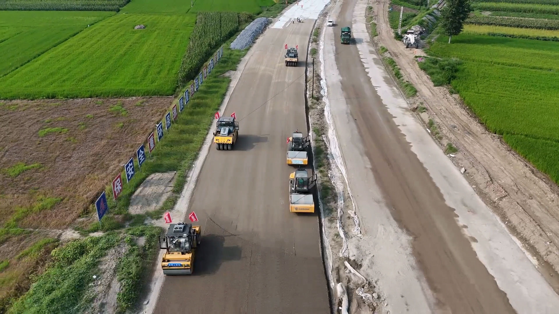 9月5日上午,安徽水利Y011蚌淮高速劉府出入口連接路段機(jī)聲隆隆,多臺(tái)攤鋪機(jī)和壓路機(jī)正在進(jìn)行二層水穩(wěn)攤鋪?zhàn)鳂I(yè)。