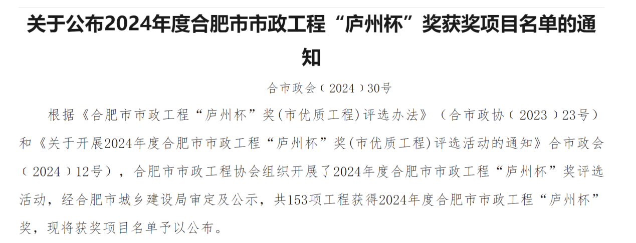 近日,經(jīng)合肥市城鄉(xiāng)建設(shè)局審定,合肥市市政工程協(xié)會(huì)正式公布2024年度合肥市市政工程“廬州杯”獲獎(jiǎng)項(xiàng)目名單,我公司承建的瑤海區(qū)板橋河初期雨水徑流污染控制工程項(xiàng)目順利通過(guò)評(píng)審,榜上有名。
