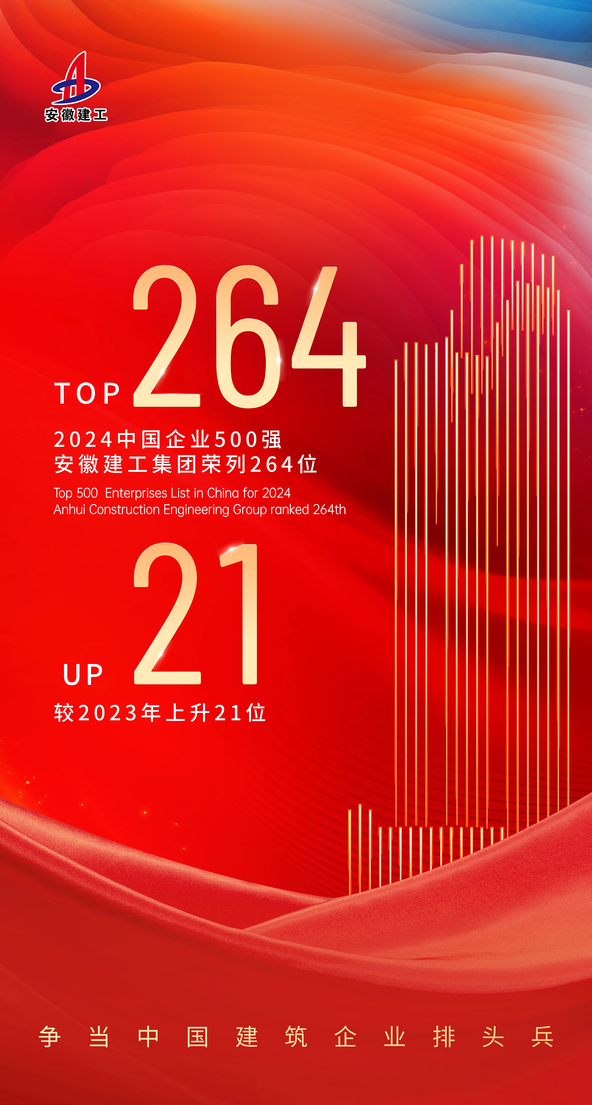 9月11日,中國(guó)企業(yè)聯(lián)合會(huì)、中國(guó)企業(yè)家協(xié)會(huì)發(fā)布2024中國(guó)企業(yè)500強(qiáng)榜單。安徽建工集團(tuán)以954.26億元的營(yíng)業(yè)收入位列榜單第264位,較2023年的285位提升21位,連續(xù)16年榮登中國(guó)企業(yè)500強(qiáng),行業(yè)認(rèn)可度、品牌及社會(huì)影響力有效提升。