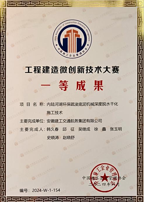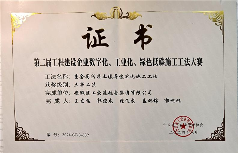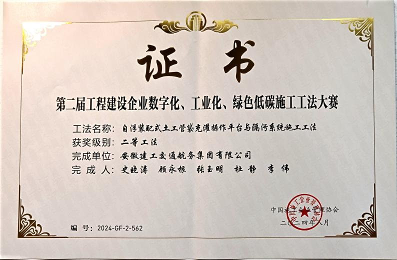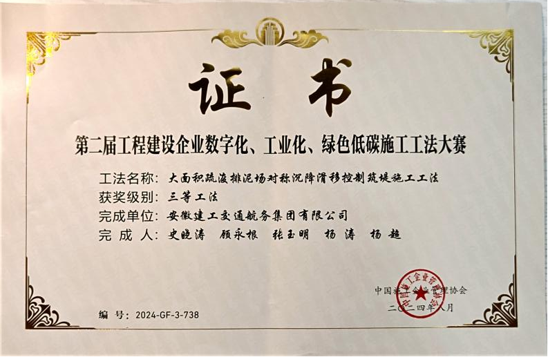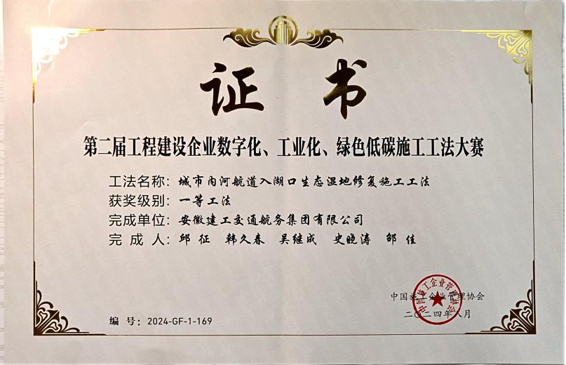 在工程建設(shè)企業(yè)“數(shù)字化、工業(yè)化、綠色低碳”施工工法大賽中,公司申報(bào)的“城市內(nèi)河航道入湖口生態(tài)濕地修復(fù)施工工法”、“自浮裝配式土工管袋充灌操作平臺(tái)與隔污系統(tǒng)施工工法”、“重金屬污染土壤異位淋洗施工工法”、“大面積疏浚排泥場對稱沉降滑移控制筑堤施工工法”分別榮獲一等獎(jiǎng)、二等獎(jiǎng)、三等獎(jiǎng)。