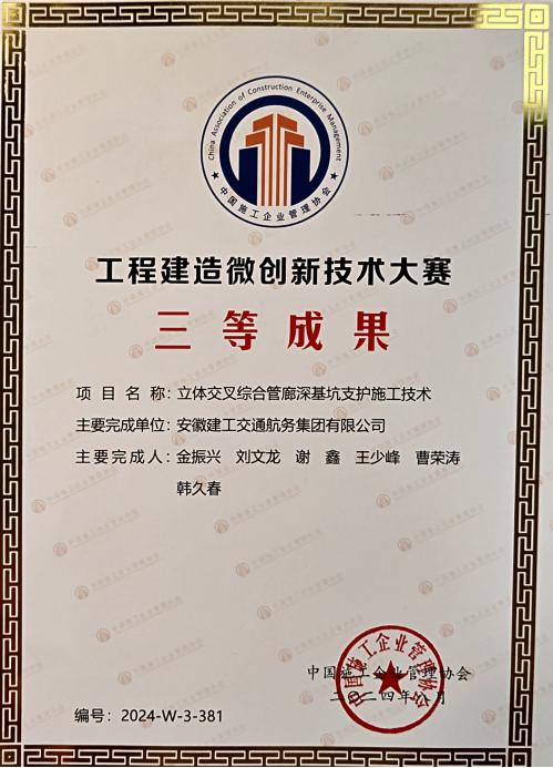 在工程建造微創(chuàng)新技術(shù)大賽中,公司申報(bào)的“內(nèi)陸河湖環(huán)保疏浚底泥機(jī)械深度脫水干化施工技術(shù)”和“立體交叉綜合管廊深基坑支護(hù)施工技術(shù)”分別榮獲一等獎(jiǎng)和三等獎(jiǎng)。