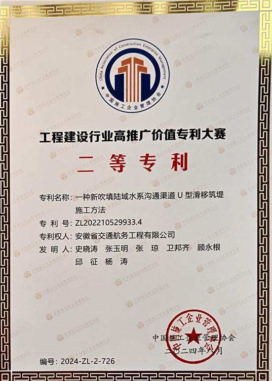 在工程建設(shè)行業(yè)高推廣價(jià)值專利大賽中,公司申報(bào)的“一種新吹填陸域水系溝通渠道U型滑移筑堤施工方法”發(fā)明專利榮獲二等獎(jiǎng)。