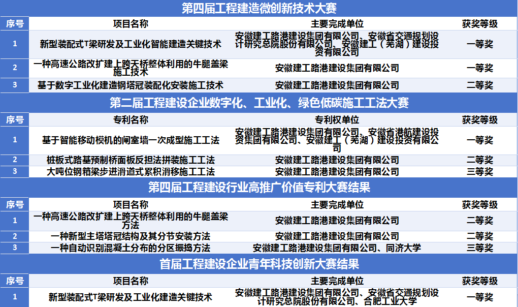 近日,第六屆工程建設(shè)行業(yè)科技創(chuàng)新大會在武漢召開,會上頒布了第四屆工程建造微創(chuàng)新技術(shù)大賽、第二屆工程建設(shè)企業(yè)數(shù)字化、工業(yè)化、綠色低碳施工工法大賽、第四屆工程建設(shè)行業(yè)高推廣價值專利大賽和首屆青年科技創(chuàng)新大賽獲獎成果。建工路港共斬獲一等獎3項,二等獎5項,三等獎2項。