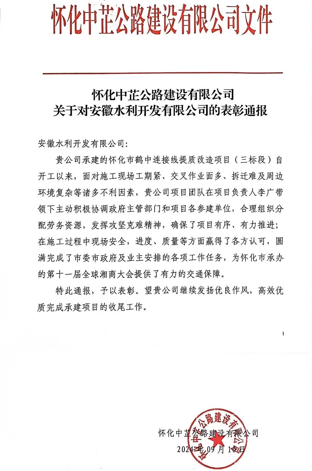近日,安徽水利承建的鶴中連接線提質(zhì)改造(三標(biāo)段)項(xiàng)目和滁州南揚(yáng)郡安置小區(qū)弱電智能化工程項(xiàng)目榮獲業(yè)主單位表彰。