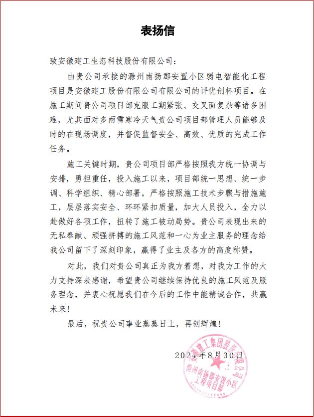 信中對(duì)公司參建的滁州南揚(yáng)郡安置小區(qū)弱電智能化工程保質(zhì)保量完成各項(xiàng)施工任務(wù)表示祝賀,對(duì)項(xiàng)目部全體人員主動(dòng)克服施工困難,科學(xué)合理組織現(xiàn)場(chǎng)施工,嚴(yán)格管控項(xiàng)目建設(shè)質(zhì)量安全,充分展示國(guó)企擔(dān)當(dāng)給予高度評(píng)價(jià)。