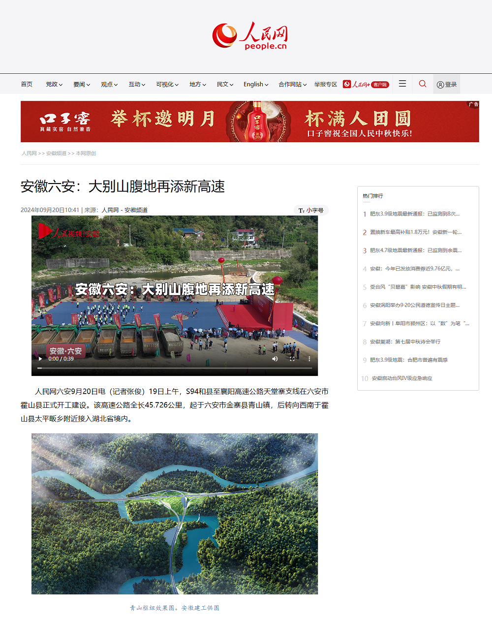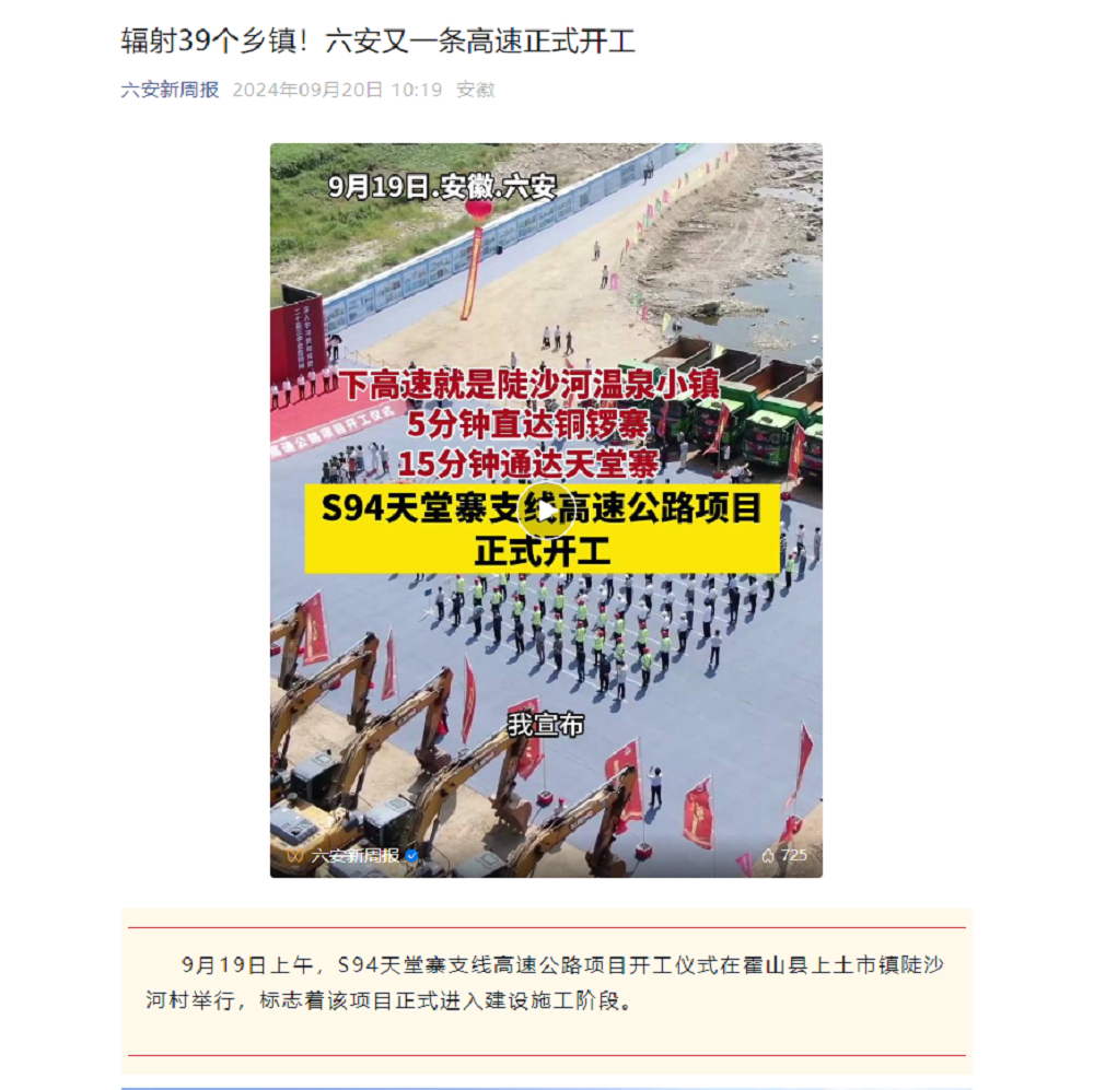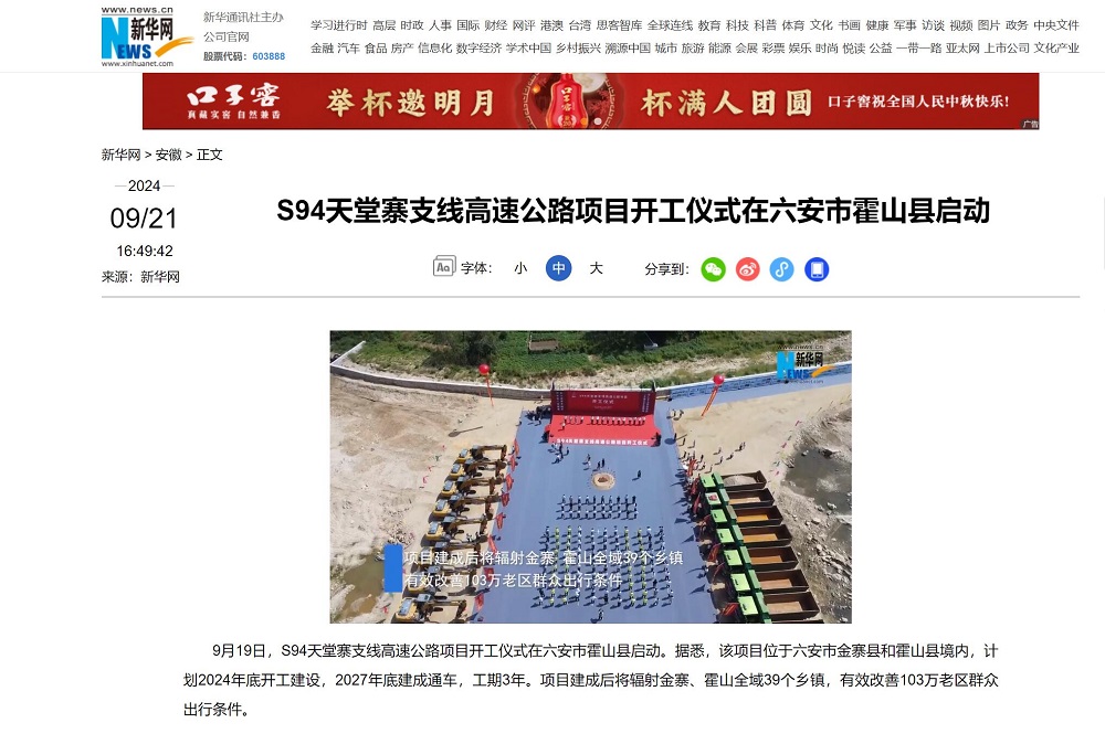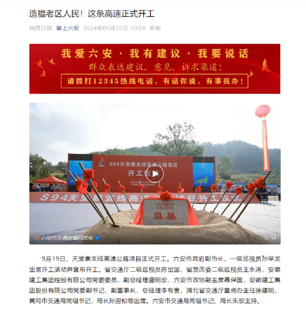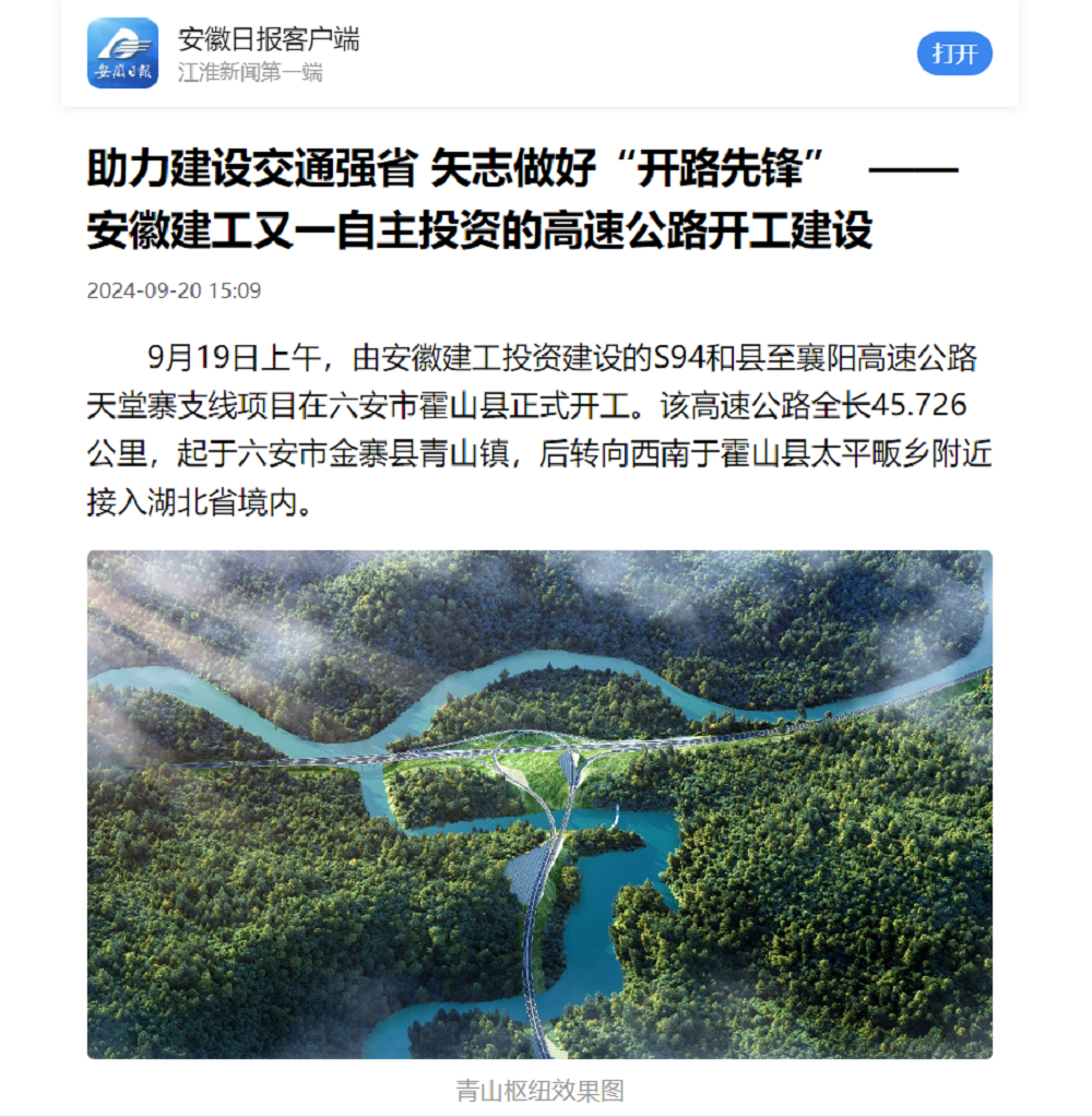 9月19日上午,由安徽建工投資建設(shè)的S94和縣至襄陽高速公路天堂寨支線項(xiàng)目在六安市霍山縣舉辦開工儀式,新華網(wǎng)、人民網(wǎng)、安徽日報、皖西日報等主流媒體紛紛聚焦項(xiàng)目開工。