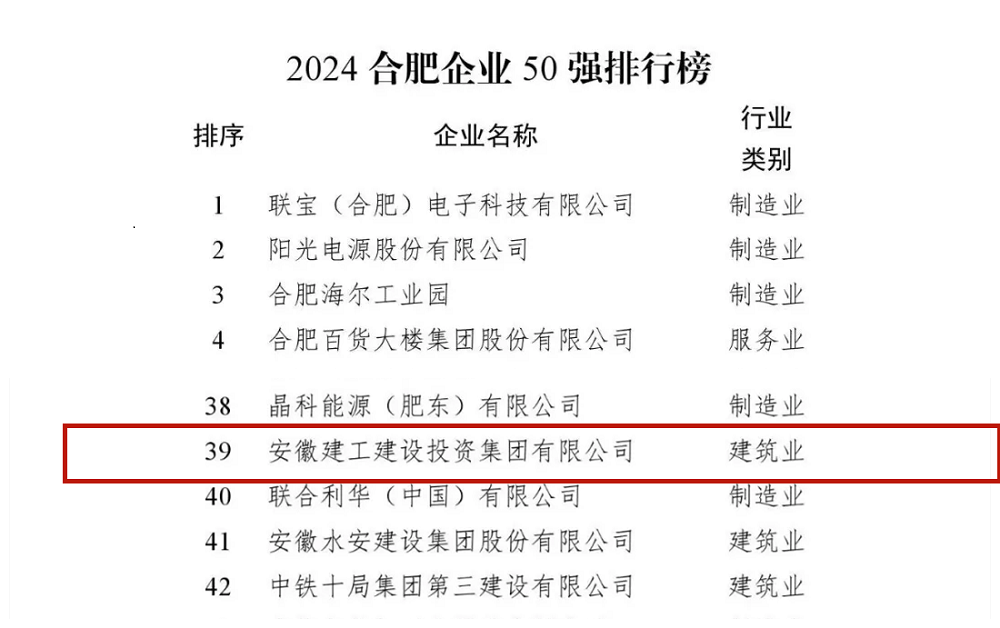 2024年9月22日,合肥市企業(yè)(企業(yè)家)聯(lián)合會發(fā)布2024合肥企業(yè)50強榜單。憑借出色的綜合實力,建工建投集團連續(xù)三年入選!