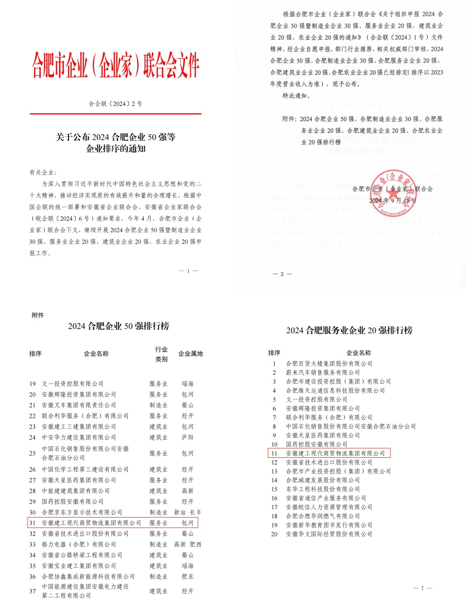 近日,合肥市企業(yè)(企業(yè)家)聯(lián)合會(huì)發(fā)布了2024合肥企業(yè)50強(qiáng)、合肥服務(wù)業(yè)企業(yè)20強(qiáng)榜單,建工商貿(mào)物流連續(xù)四年入選,分別位列第31位和第11位。