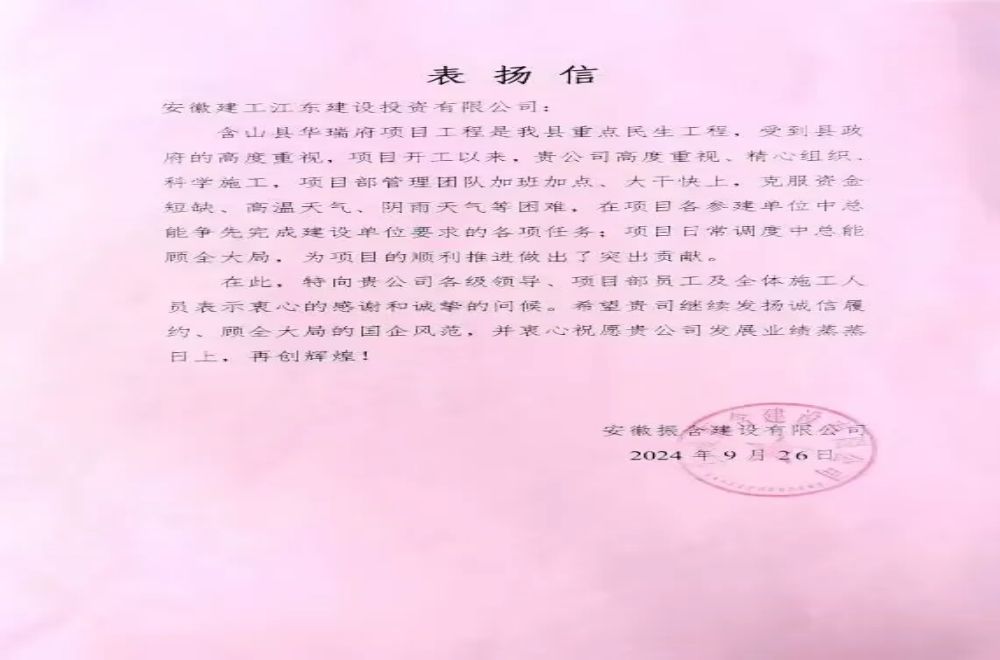 9月26日,安徽建工江東建投收到業(yè)主感謝信,信中對(duì)江東建投高度重視、精心組織含山縣華瑞府項(xiàng)目科學(xué)施工表示感謝,對(duì)項(xiàng)目團(tuán)隊(duì)迎難而上、全力以赴、率先高效完成建設(shè)任務(wù)給予高度肯定。