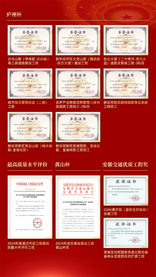 9月,承建的合廬產(chǎn)業(yè)新城龍橋路等8條市政道路工程施工2標(biāo)段等8個(gè)項(xiàng)目獲得合肥市市政工程廬州杯獎(jiǎng)。