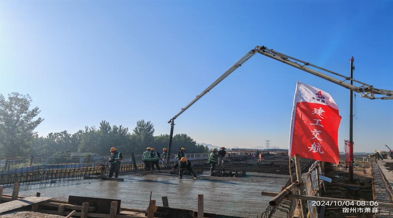 近日,經(jīng)過 10小時的連續(xù)奮戰(zhàn),徐淮阜高速宿州段路基02標(biāo)項目孫圩子互通C匝道橋最后一聯(lián)現(xiàn)澆頂板澆筑完成。這標(biāo)志著孫圩子互通區(qū)所有現(xiàn)澆梁全部圓滿澆筑完成,項目全面進(jìn)入快速收尾階段,為實現(xiàn)早日通車目標(biāo)打下了堅實基礎(chǔ)。