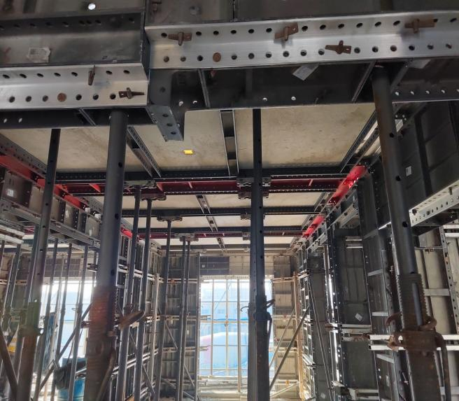 針對住宅樓豎向結(jié)構(gòu)為M型鋼格構(gòu)剪力墻、水平構(gòu)件為疊合板的結(jié)構(gòu)特點,項目部經(jīng)過反復論證,采用非深化鋁模作為主體結(jié)構(gòu)模板,鋁模拆除后,結(jié)構(gòu)面平整,為墻體抹灰提供了良好的基層墻體。同時,對門頭過梁、短門垛、電梯井門頭過梁部分墻體進行了簡單優(yōu)化,為砌體施工提供了有利條件。對比傳統(tǒng)木模搭配鋼管內(nèi)支撐,項目通過應用非深化鋁模施工技術(shù)節(jié)約成本176.41萬元,減輕了施工現(xiàn)場材料堆放和周轉(zhuǎn)管理難度,提升安全文明施工形象,獲得了建設(shè)單位的認可和表揚。
