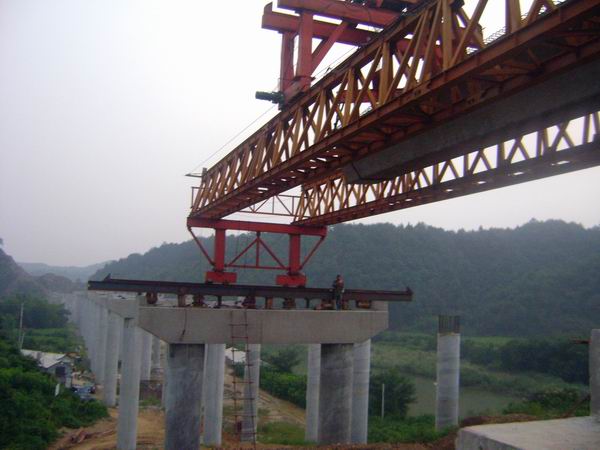 該橋左幅17跨,右幅16跨,為25 m先簡(jiǎn)支后連續(xù)預(yù)應(yīng)力砼小箱梁,全橋共有箱梁132片,最大安裝重量75t。采用1套QD100T/30m架橋機(jī),依次進(jìn)行K10+236.75大橋左右幅箱梁安裝,箱梁采用運(yùn)梁炮車運(yùn)輸。橋體處于本標(biāo)段標(biāo)尾與02標(biāo)接頭,橫跨大源河,交通不便,各種物資到達(dá)及站內(nèi)調(diào)車作業(yè)極為困難。為確保安全、優(yōu)質(zhì)地完成這次鋪架任務(wù),項(xiàng)目部精心組織,做好準(zhǔn)備工作,協(xié)調(diào)好各項(xiàng)事宜,制定了詳細(xì)、切實(shí)可行的架梁方案。