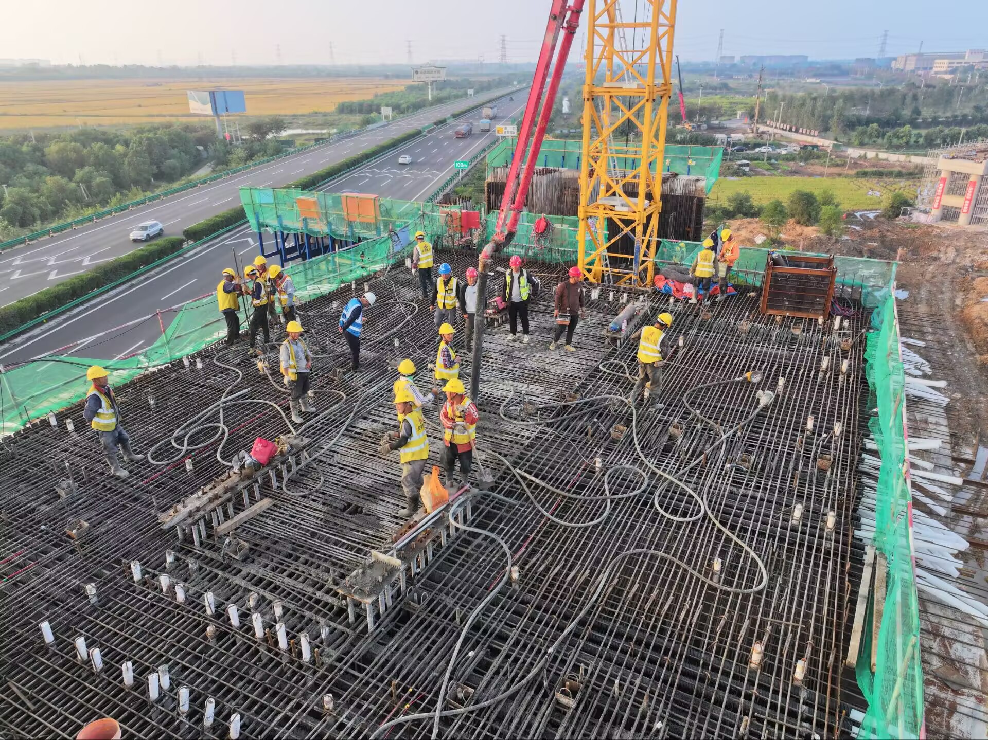 懸澆箱梁位于本項(xiàng)目豐樂樞紐主線特大橋主橋,采用45m+84m+45m跨徑,上跨G3京臺高速,導(dǎo)致項(xiàng)目施工難度大。項(xiàng)目部高度重視各施工環(huán)節(jié),精心組織、超前謀劃,并多次召開現(xiàn)場會,從施工工藝、安全管控、質(zhì)量控制到應(yīng)急保障措施等多方面進(jìn)行周密部署,項(xiàng)目一線人員輪班堅(jiān)守、攻堅(jiān)克難,確保澆筑過程中安全質(zhì)量有序可控。