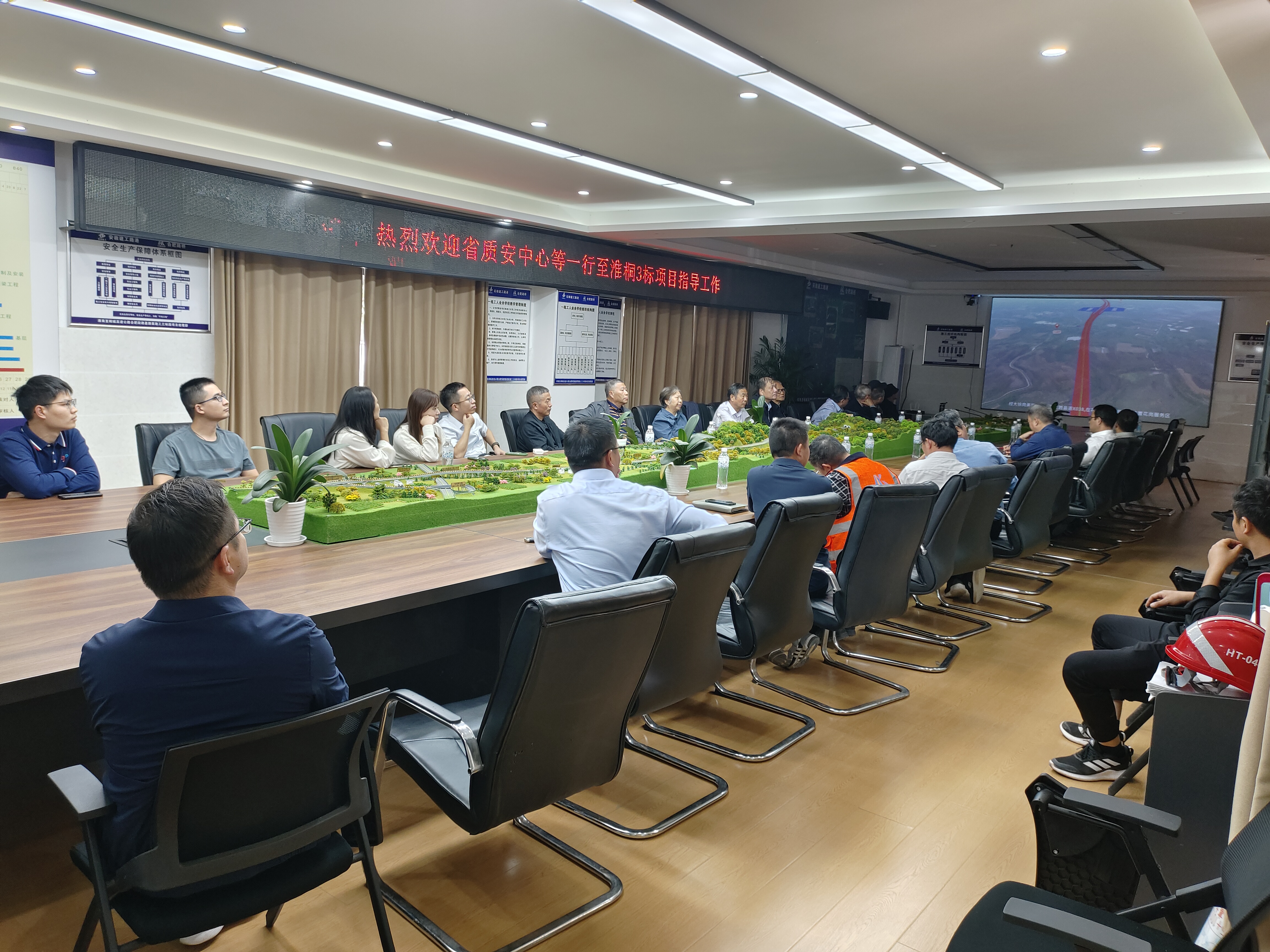 高學(xué)華一行首先參觀了紫蓬山隧道口施工現(xiàn)場(chǎng),聽(tīng)取了項(xiàng)目部關(guān)于隧道概況及當(dāng)前施工進(jìn)展匯報(bào),隨后在會(huì)議室觀看項(xiàng)目施工動(dòng)畫(huà)、航拍視頻并就當(dāng)前施工的重難點(diǎn)展開(kāi)了座談交流。