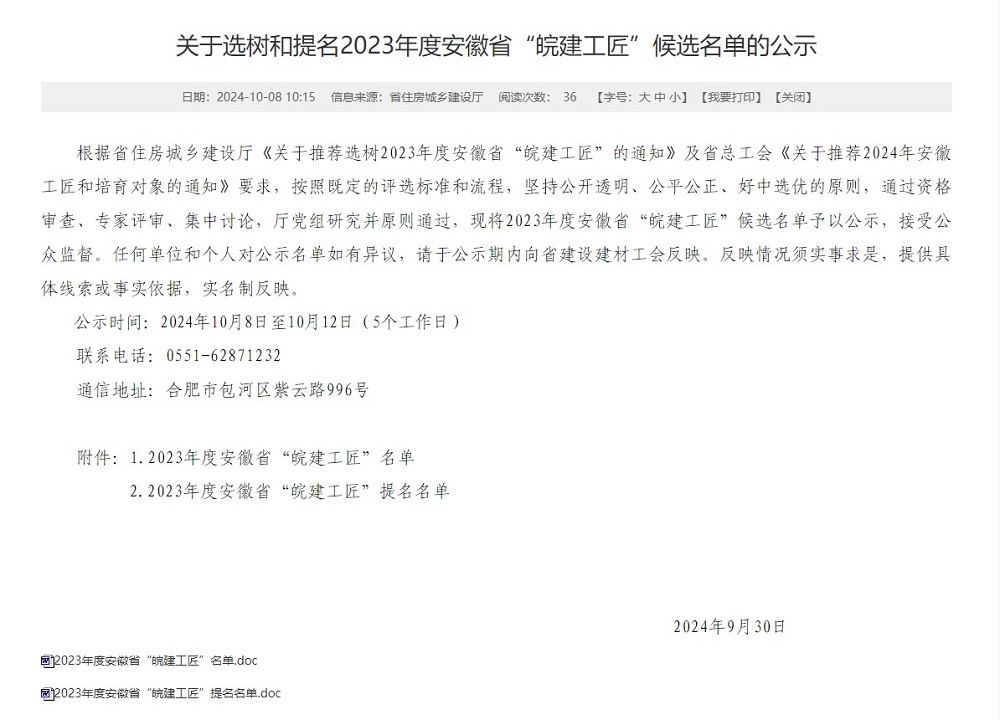 近日,安徽省住房和城鄉(xiāng)建設(shè)廳發(fā)布2023年度安徽省“皖建工匠”候選名單,建工建投集團(tuán)姚啟海被命名為“皖建工匠”,李健獲“皖建工匠”提名。
