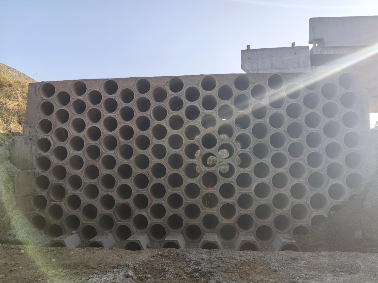 項(xiàng)目在施工過程中積極參與科研創(chuàng)新,先后進(jìn)行了蜂窩路基的結(jié)構(gòu)、材料與施工關(guān)鍵技術(shù)課題的研究和坡改平生態(tài)護(hù)坡新工藝。蜂窩路基結(jié)構(gòu)的研發(fā)既解決了土源問題,又推進(jìn)了固廢資源化。坡改平生態(tài)護(hù)坡研發(fā)出了一種新型生態(tài)護(hù)坡技術(shù),使其既具有老式護(hù)坡磚施工簡單、工程造價(jià)低的優(yōu)點(diǎn),又能克服水土保持效果差的弊端。通過多方案的比選論證,提出新型的 “坡改平”生態(tài)護(hù)坡磚技術(shù)(以下稱 “新型護(hù)坡磚”),利用“坡改平”護(hù)坡磚的特殊結(jié)構(gòu),將整個(gè)坡面分解為一個(gè)個(gè) “小平面”,以“小平面”土體的穩(wěn)定,實(shí)現(xiàn)整個(gè)坡面的穩(wěn)定,從而解決坡面土壤流失問題。