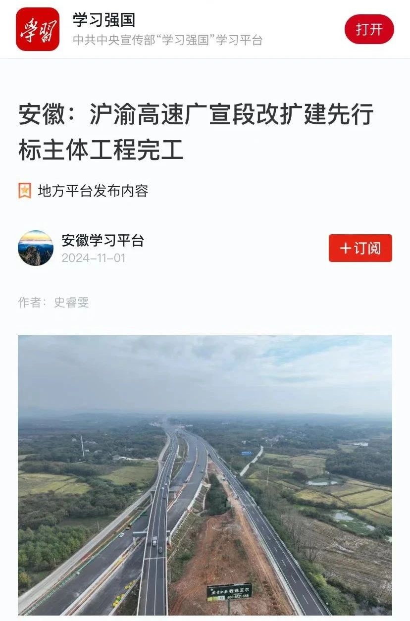 近日,安徽水利承建的滬渝國(guó)家高速公路安徽省廣德至宣城段改擴(kuò)建工程先行開(kāi)工段項(xiàng)目主體工程全部完成,項(xiàng)目進(jìn)展受到中安在線、新安晚報(bào)、學(xué)習(xí)強(qiáng)國(guó)等媒體關(guān)注報(bào)道。