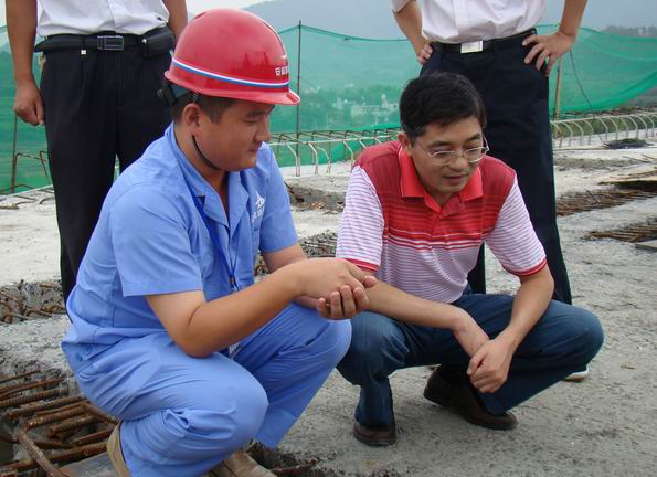 在項(xiàng)目現(xiàn)場(chǎng),王副總來到跨省道217 空心板梁施工現(xiàn)場(chǎng),與橋梁施工負(fù)責(zé)人李士莊親切交談。他說,在網(wǎng)站上我看到了你們順利完成跨省道217 20m空心板梁吊裝工作的報(bào)道,我很高興,今天專程來到這里,來看望大家,希望你們?cè)诮窈蟮墓ぷ髦泄芾砩弦鹿Ψ?,技術(shù)上要進(jìn)步。王副總與現(xiàn)場(chǎng)的技術(shù)工人一一握手,勉勵(lì)他們勤于學(xué)習(xí),努力工作。