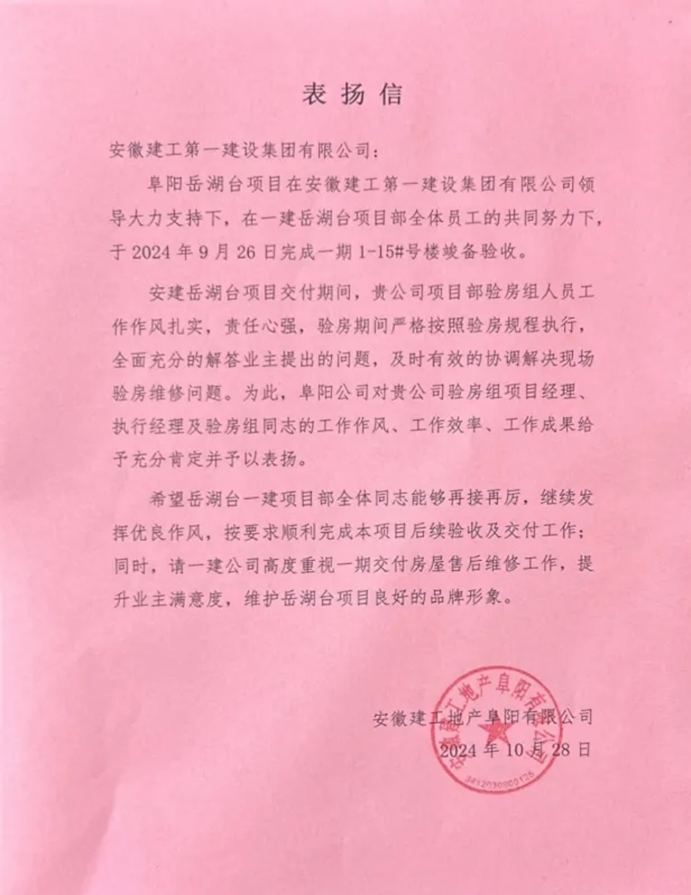 近日,安徽建工地產(chǎn)阜陽有限公司發(fā)來的表揚信,表揚建工一建領(lǐng)導對安建岳湖臺項目一期1-15#樓竣備驗收工作的大力支持和項目部全體職工的勤懇付出。