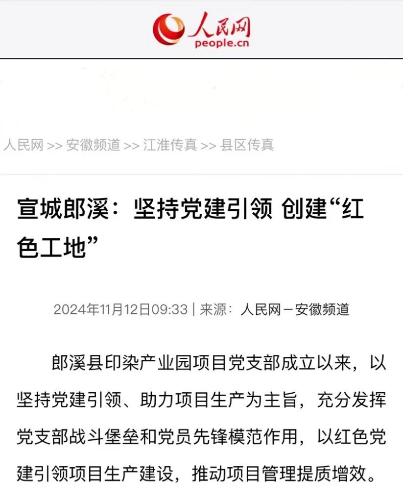 近日,安徽水利郎溪縣印染產(chǎn)業(yè)園項(xiàng)目充分發(fā)揮黨建引領(lǐng)作用,積極開展創(chuàng)建“紅色工地”,受到人民網(wǎng)等媒體關(guān)注報道。