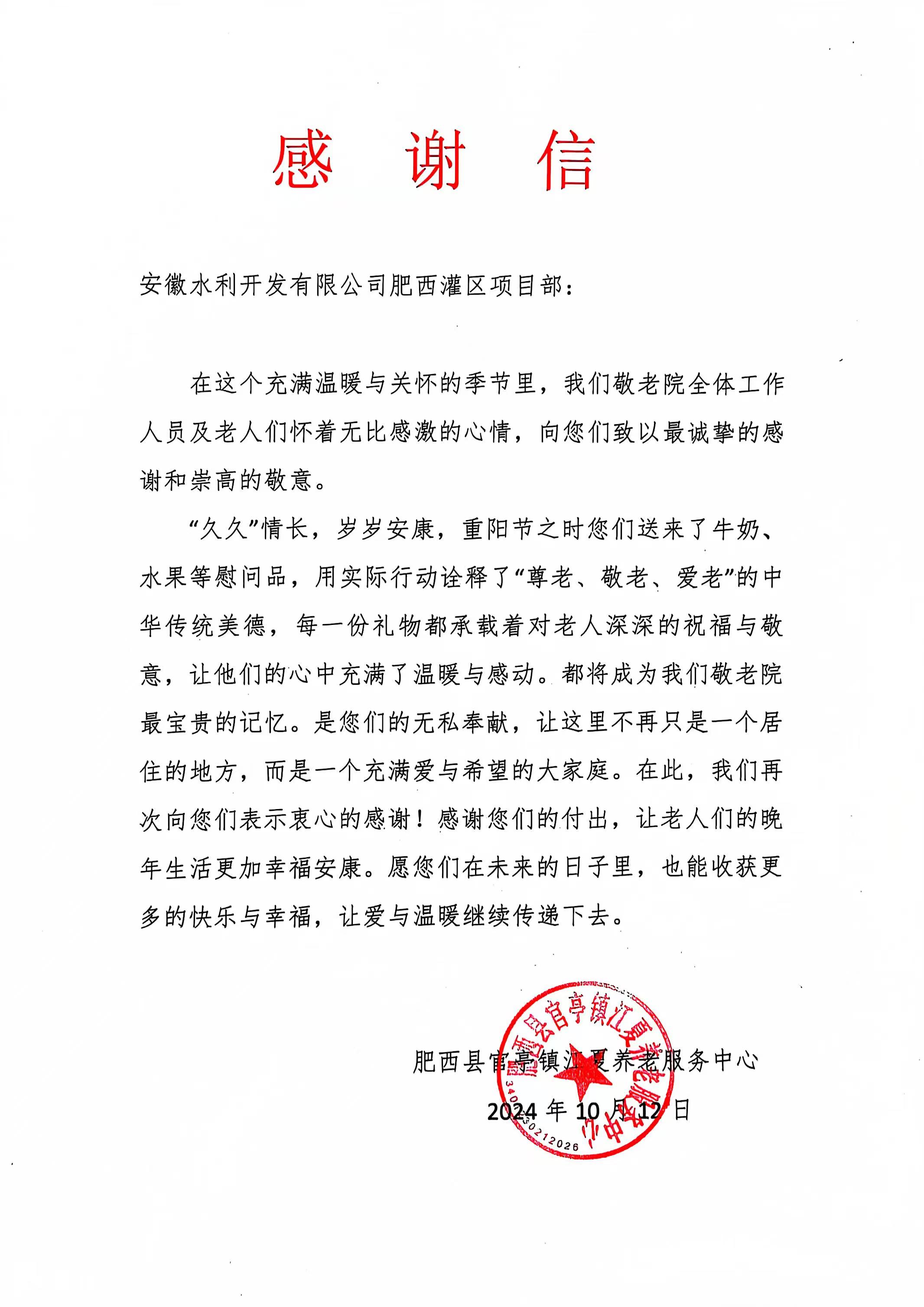 近日,安徽水利肥西縣2023年度灌區(qū)灌排能力和水環(huán)境提升工程項(xiàng)目部收到一封來自肥西縣官亭鎮(zhèn)江夏養(yǎng)老服務(wù)中心的感謝信。