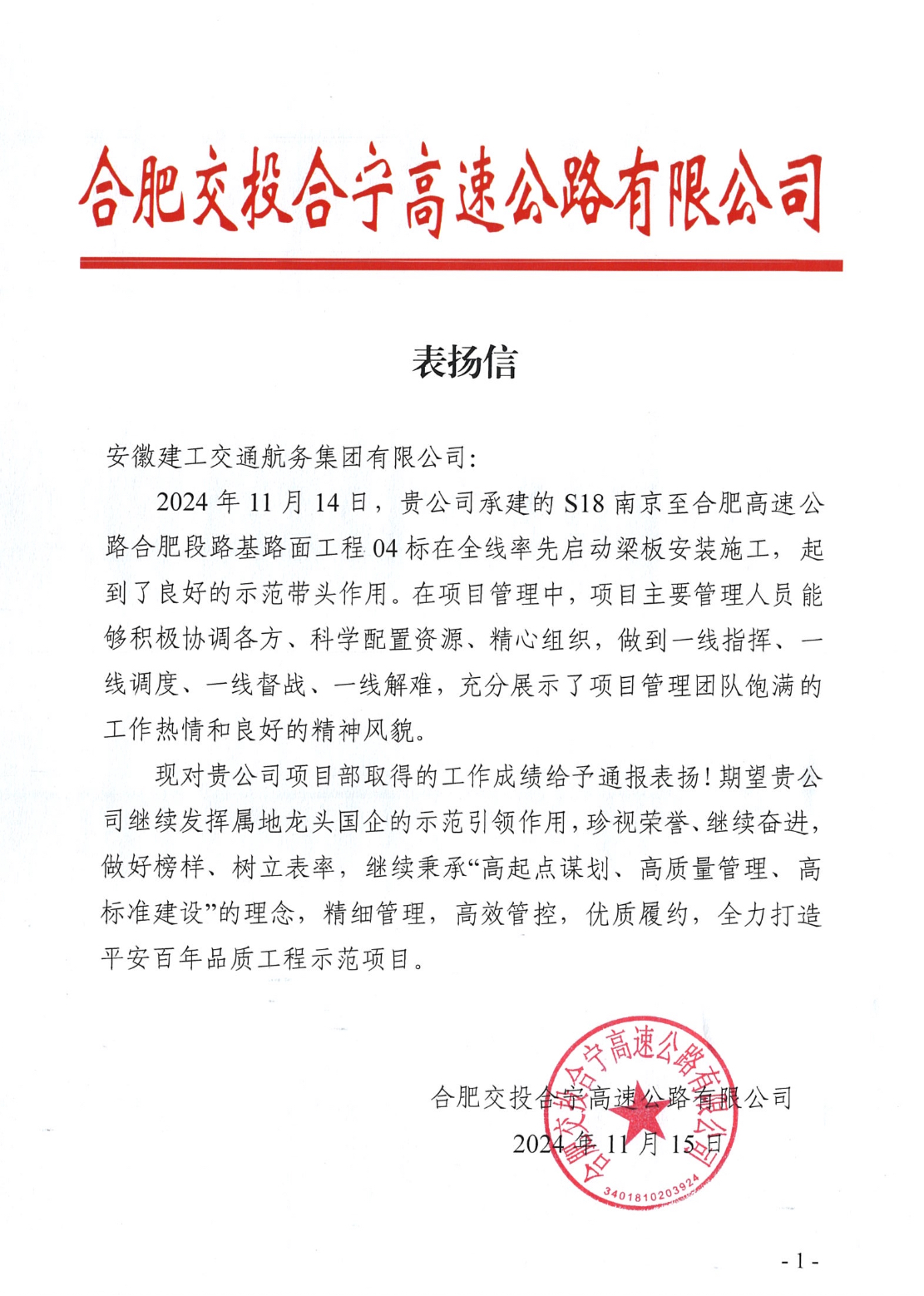 11月15日,S18南京至合肥高速公路合肥段路基路面工程04標項目收到來自業(yè)主單位-合肥交投合寧高速公路有限公司表揚信。