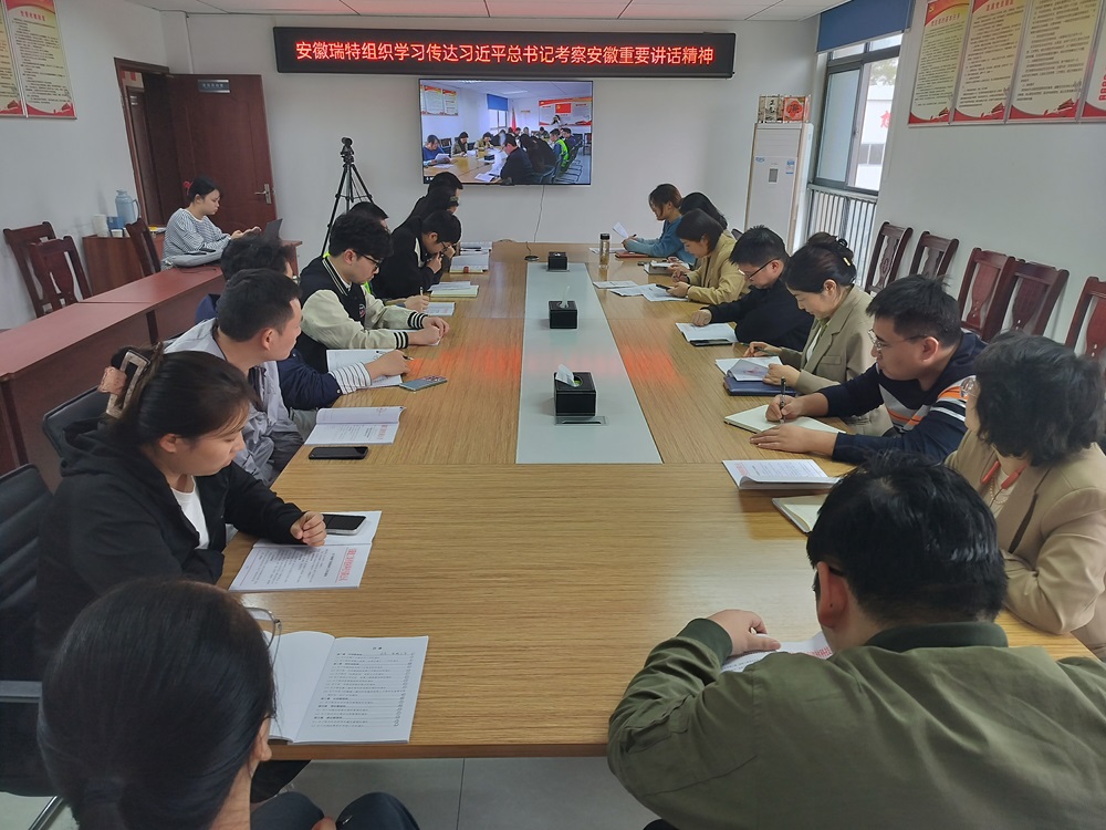 安徽瑞特組織傳達(dá)學(xué)習(xí)習(xí)近平總書記考察安徽重要講話精神,全體黨員、各部門負(fù)責(zé)人及青年骨干參加。會議強(qiáng)調(diào),全體員工要深入學(xué)習(xí)領(lǐng)會講話精神要義,把學(xué)習(xí)宣傳貫徹習(xí)近平總書記考察安徽重要講話精神作為當(dāng)前和今后一個時期的首要政治任務(wù)。一是認(rèn)真開展學(xué)習(xí)研討,做到學(xué)深悟透、知行合一;二是抓好宣傳宣講,營造濃厚氛圍;三是結(jié)合公司實際,推動貫徹落實。