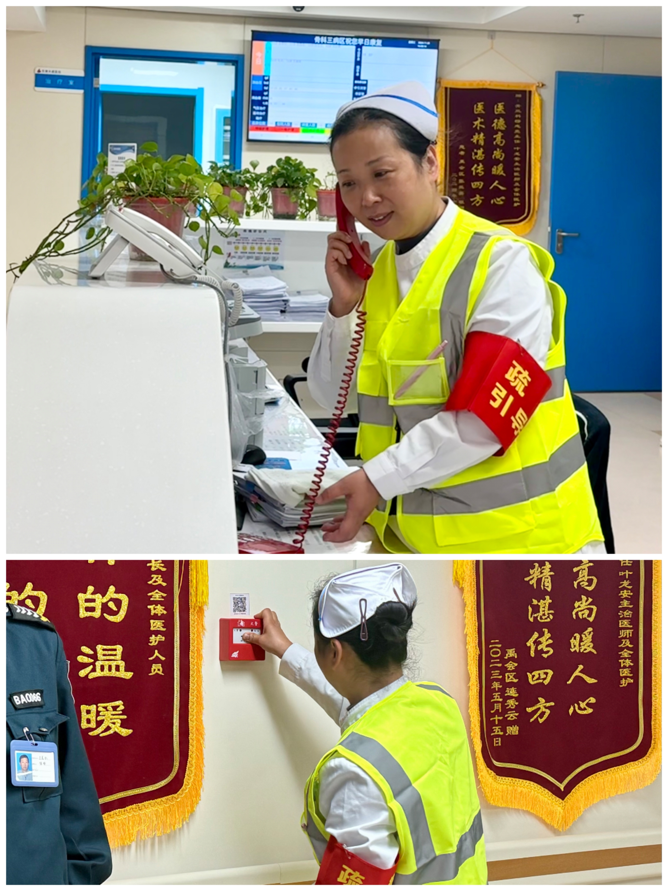 此次演練模擬住院樓11樓脊柱微創(chuàng)外科病房患者吸煙引燃被褥,易燃物被引燃,引起火災(zāi),值班人員發(fā)現(xiàn)火情后立即撥打“119”報警,并用滅火器進行初起火災(zāi)的撲救。按照疏散演練預(yù)案,疏散引導(dǎo)組帶領(lǐng)病區(qū)患者及家屬彎腰、捂住口鼻沿著消防疏散路線有序撤離到指定安全地點。醫(yī)療救護組仔細(xì)檢查現(xiàn)場,做好救護工作,并在疏散后的房間貼上“無人”標(biāo)識,確保疏散救援工作的準(zhǔn)確性和高效性。