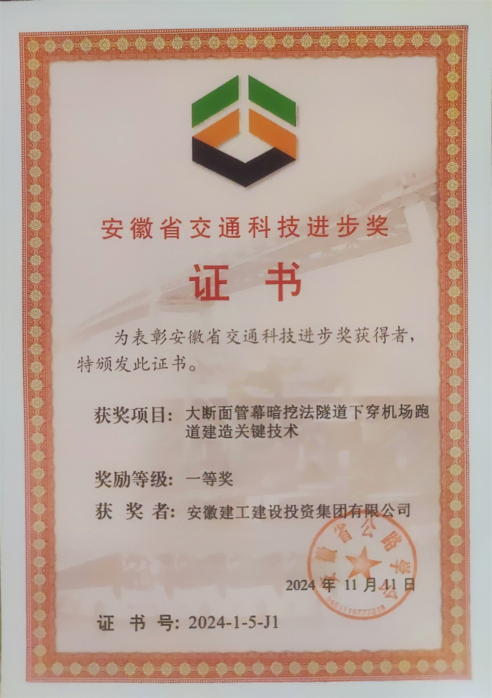安徽建工建設(shè)投資集團(tuán)申報(bào)的5項(xiàng)研究成果獲獎(jiǎng),其中《大斷面管幕暗挖法隧道下穿機(jī)場(chǎng)跑道建造關(guān)鍵技術(shù)》榮獲一等獎(jiǎng);建工建投集團(tuán)被授予2023-2024年度先進(jìn)會(huì)員單位;安徽省公路學(xué)會(huì)橋隧專委會(huì)被授予2023-2024年度先進(jìn)學(xué)會(huì)和分支機(jī)構(gòu)稱號(hào)。公司黨委委員、副總經(jīng)理、總工程師陳莘作為獲獎(jiǎng)單位代表上臺(tái)領(lǐng)獎(jiǎng)。