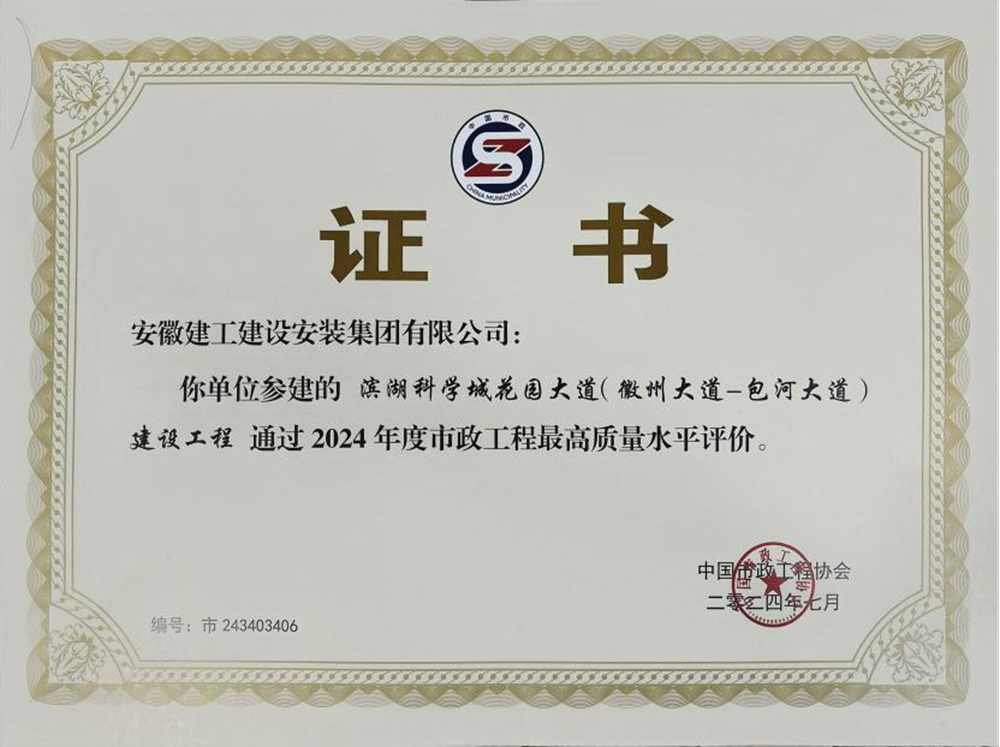 近日,中國市政工程協(xié)會(huì)頒發(fā)了2024年度市政工程最高質(zhì)量水平評價(jià)獎(jiǎng)證書,建工安裝濱湖科學(xué)城花園大道(徽州大道-包河大道)建設(shè)工程項(xiàng)目榮獲市政工程最高質(zhì)量水平評價(jià)獎(jiǎng),這是本項(xiàng)目繼榮獲“華東優(yōu)質(zhì)安裝工程獎(jiǎng)”、“黃山杯”之后的又一國家級獎(jiǎng)項(xiàng)。
