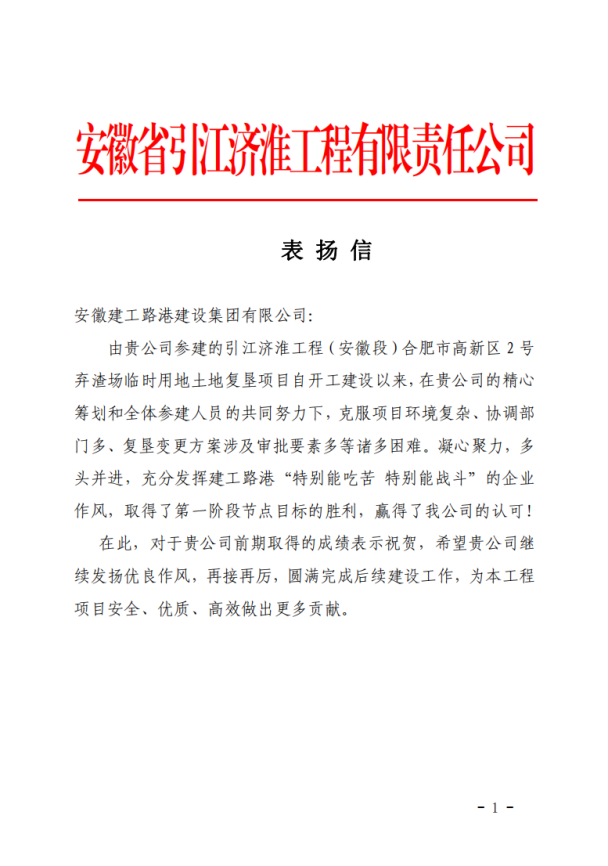 日前,建工路港引江濟(jì)淮2號棄渣場復(fù)墾項(xiàng)目收到安徽省引江濟(jì)淮工程有限責(zé)任公司的表揚(yáng)信。