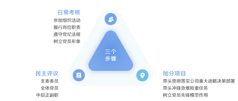 遵循“實(shí)事求是、立足崗位、獎(jiǎng)優(yōu)罰劣、民主公開”的原則,設(shè)置日??己?、民主評(píng)議和加分項(xiàng)目三個(gè)部分,對(duì)黨員綜合表現(xiàn)進(jìn)行客觀評(píng)價(jià)。其中,日??己司劢箙⒓咏M織活動(dòng)、履行崗位職責(zé)、遵守黨紀(jì)法規(guī)、樹立黨員形象四個(gè)主要方面,設(shè)置扣分項(xiàng)目,對(duì)黨員履行基本義務(wù)提出明確要求。加分項(xiàng)目重在激勵(lì)黨員干部帶頭貫徹落實(shí)公司重大戰(zhàn)略決策部署、帶頭沖鋒急難險(xiǎn)重任務(wù),樹立黨員先鋒模范作用。