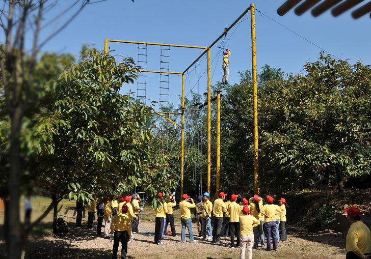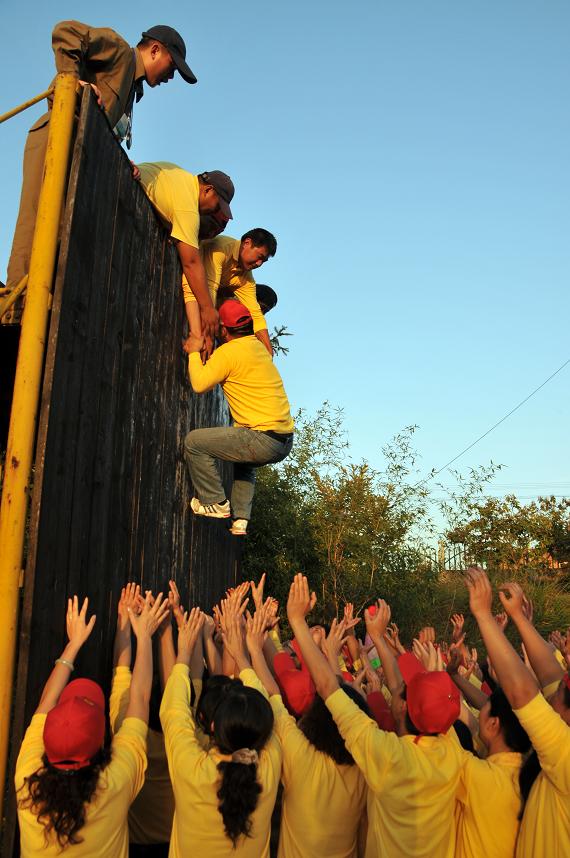 培訓(xùn)公司精心設(shè)計(jì)了“破冰”、“盲人方陣”、“車(chē)輪滾滾”、“高空抓杠”及“生命墻”等有趣、刺激而又極具挑戰(zhàn)性的活動(dòng)。培訓(xùn)活動(dòng)在輕松幽默的“破冰”游戲中開(kāi)始,使大家充分體驗(yàn)了團(tuán)結(jié)協(xié)作、平等友愛(ài)的快樂(lè)。接著培訓(xùn)教練將參訓(xùn)人員隨機(jī)分為六個(gè)團(tuán)隊(duì),大家推選了自己的隊(duì)長(zhǎng)、隊(duì)秘、旗手,創(chuàng)建了自己隊(duì)名、隊(duì)訓(xùn)、隊(duì)歌,增強(qiáng)了隊(duì)員的歸屬感和團(tuán)隊(duì)意識(shí)。從“盲人方陣”中對(duì)決策的制定、調(diào)整,到組織實(shí)施中的服從執(zhí)行;從“車(chē)輪滾滾”中的群策群力、統(tǒng)一配合,到目標(biāo)的最終實(shí)現(xiàn);從“高空抓杠”的緊張、彼此激勵(lì),到勇敢的超越自我;從整個(gè)團(tuán)隊(duì)翻越“生命墻”方案、方法的及時(shí)制定,到隊(duì)員間的相互鼓勵(lì)、幫助,到每個(gè)隊(duì)員的奮力拼搏,直至團(tuán)隊(duì)精神得到升華……無(wú)一不在大家心中留下難忘的記憶。笑聲、掌聲、喊聲,不絕于耳,活動(dòng)結(jié)束時(shí)激情仍蕩漾在大家的臉上。