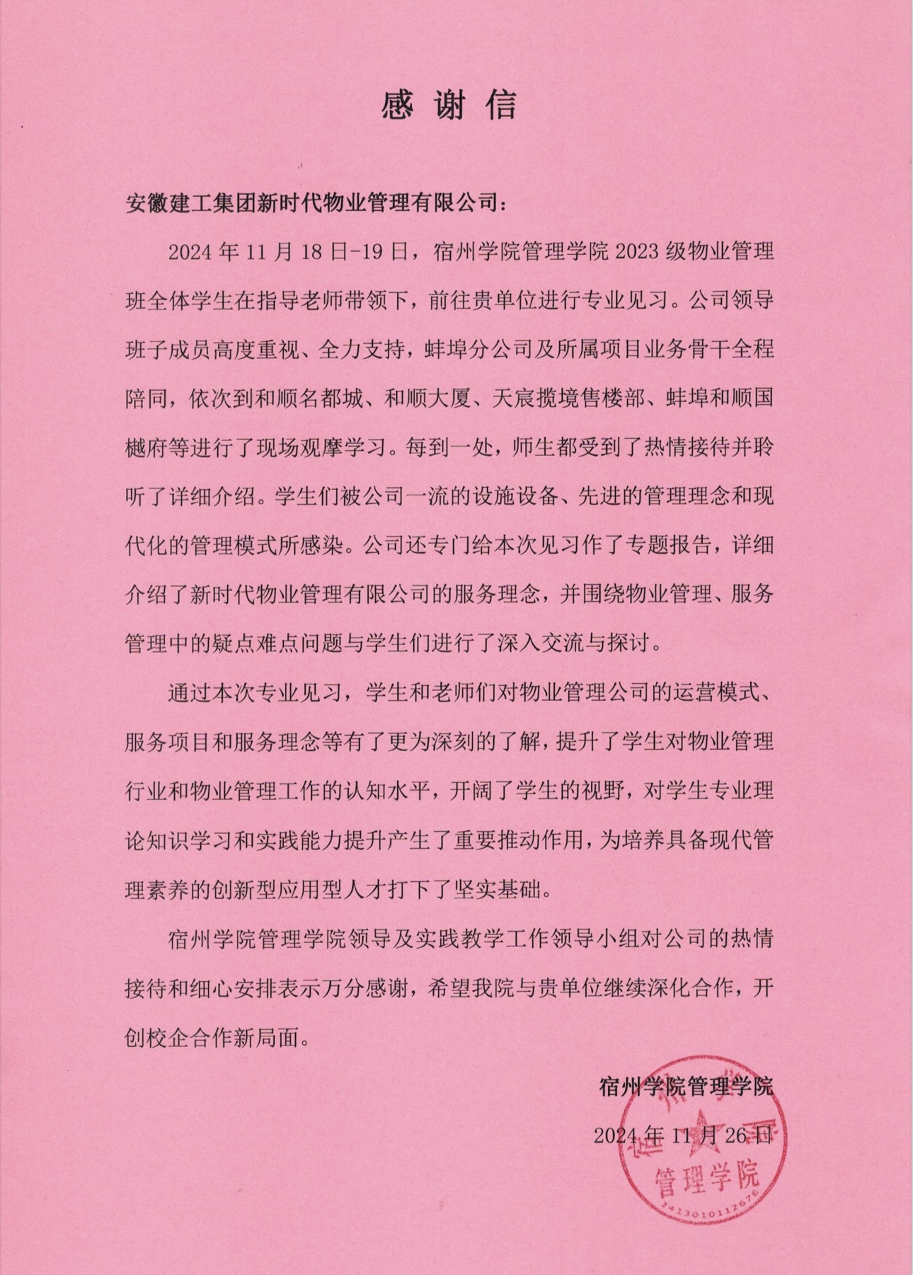 近日,物業(yè)公司榮幸收到來自宿州學院管理學院的感謝信。信中,管理學院對物業(yè)公司在專業(yè)見習中的熱情接待與精心安排表達了深切謝意。