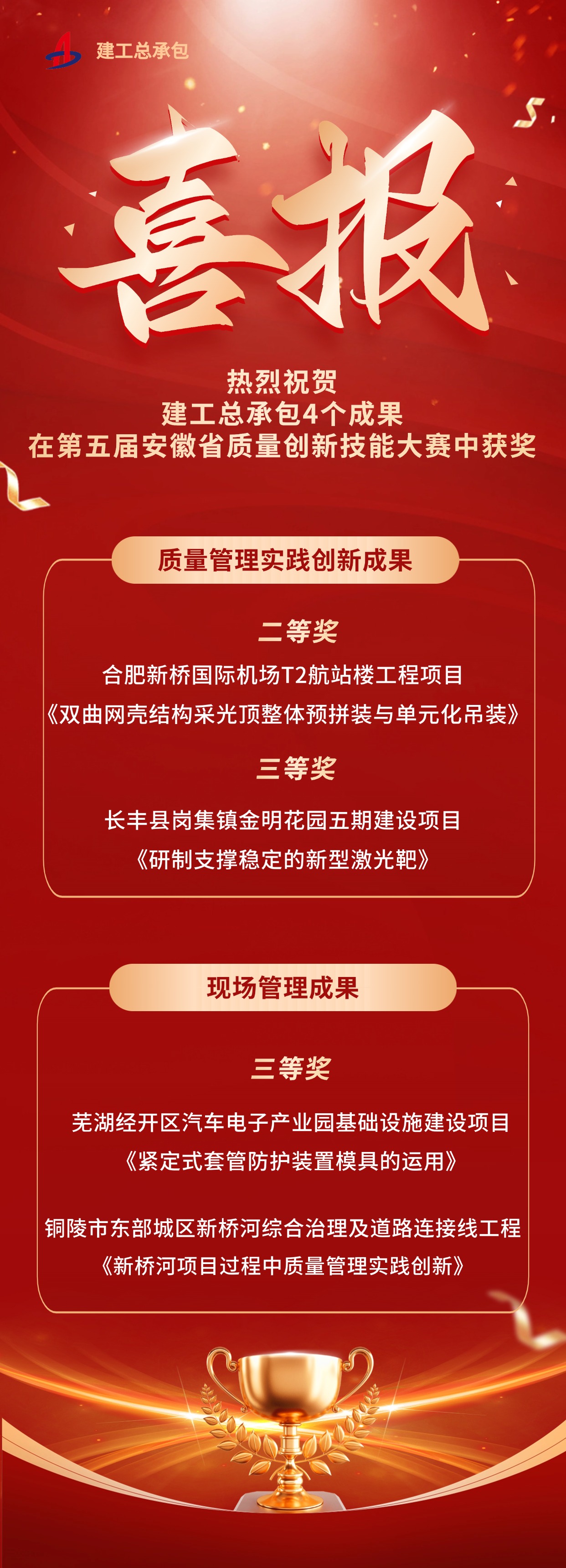 12月2日至5日,第五屆安徽省質(zhì)量創(chuàng)新技能大賽在淮南舉行,建工總承包代表安徽建工集團(tuán)現(xiàn)場發(fā)布作品,4個項目從348個參賽項目中脫穎而出,分獲質(zhì)量創(chuàng)新和現(xiàn)場管理類二、三等獎。