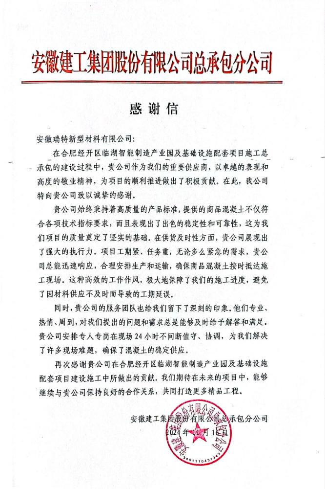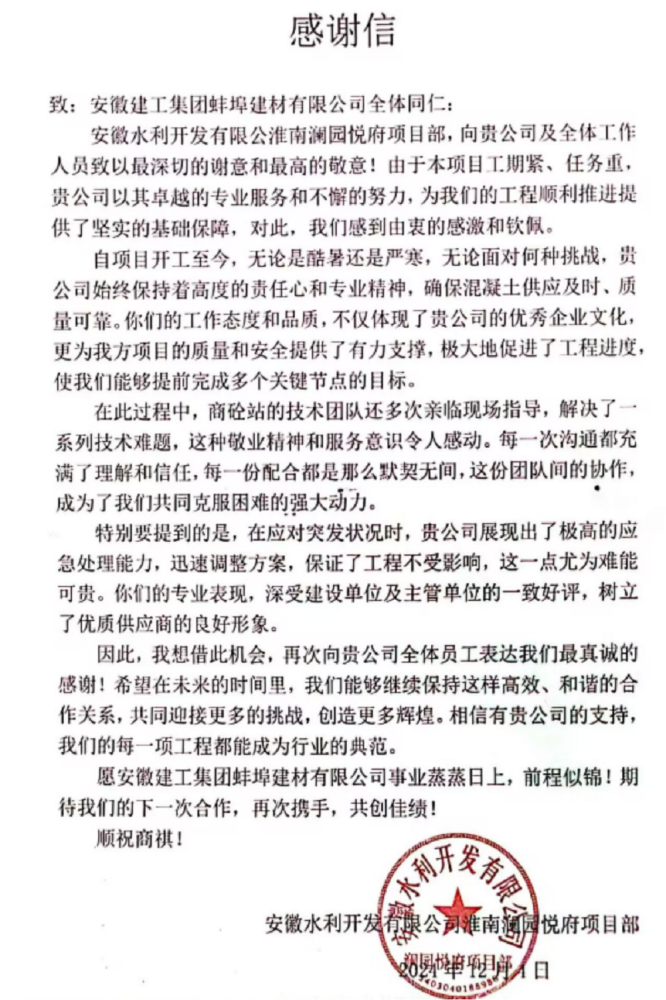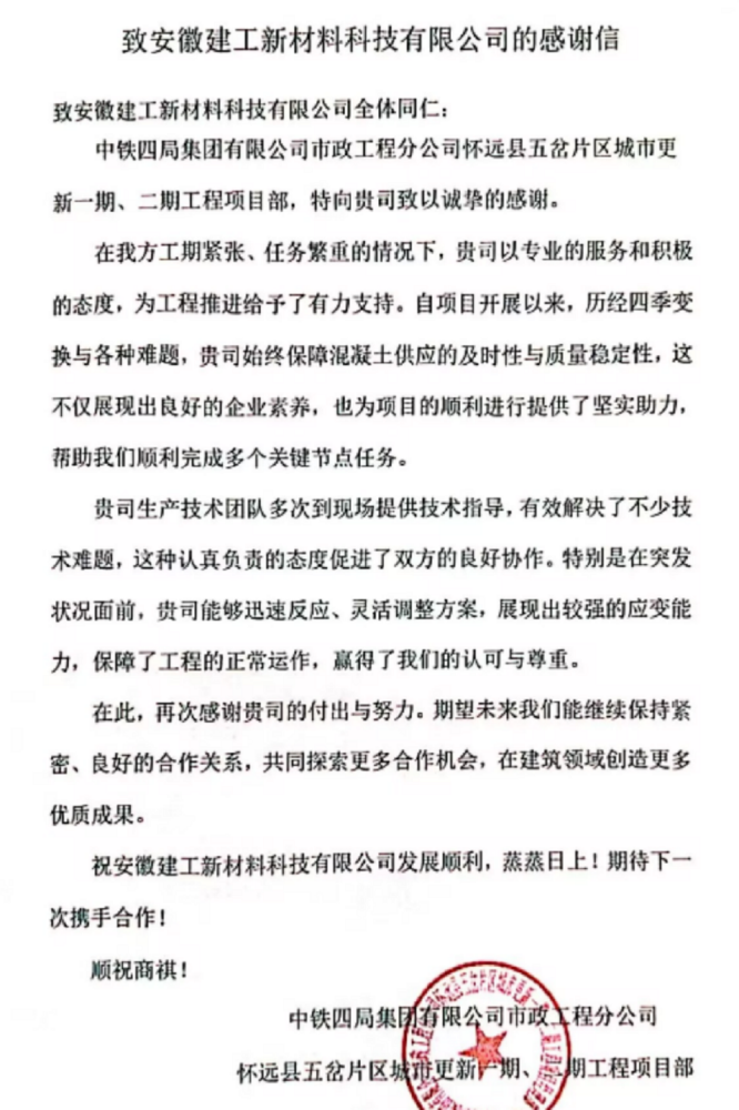 喜獲感謝信不僅是對建工建材過往成績的高度肯定,更是對我們未來發(fā)展的激勵和鞭策。建工建材將以此為契機,不斷優(yōu)化產(chǎn)品結構,提升自身實力和服務水平,與更多施工單位攜手共創(chuàng)優(yōu)質工程,以實際行動助力集團轉型發(fā)展、高質量發(fā)展、大發(fā)展。