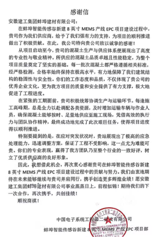 近期,建工建材憑借卓越的產(chǎn)品質量、高效的供應體系、出色的服務保障、精益求精的工作精神,收到了來自中國電子系統(tǒng)工程第二建設有限公司八寸線EPC項目、中鐵四局五岔片區(qū)城市項目、安徽水利淮南瀾園悅府項目、臨湖智能制造產(chǎn)業(yè)園項目的多封感謝信。