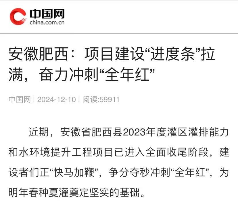 近日,安徽水利肥西縣2023年度灌區(qū)灌排能力和水環(huán)境提升工程項(xiàng)目已進(jìn)入全面收尾階段,正“快馬加鞭”沖刺年度目標(biāo)任務(wù),受到中國(guó)網(wǎng)等媒體關(guān)注報(bào)道。